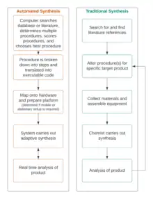 An automated synthesis is very similar in procedure to performing a manual synthesis. The overseeing chemist decides on a target molecule then formulates the experimental plan, which is a sequential series of steps. Then, they collect the required equipment and execute the plan. The automated synthesis follows the same pathway, except that the computer devises and executes the experimental plan. However, human revision is usually still required to ensure the automated route is practical and there are no implicit steps or conditions missing from the proposed procedure.[2]