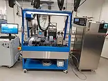 Automated synthesis or automatic synthesis is a set of techniques that use robotic equipment to perform chemical synthesis in an automated way.[1] Automating processes allows for higher efficiency and product quality although automation technology can be cost-prohibitive and there are concerns regarding overdependence and job displacement. Chemical processes were automated throughout the 19th and 20th centuries, with major developments happening in the previous thirty years, as technology advanced. Tasks that are performed may include: synthesis in variety of different conditions, sample preparation, purification, and extractions. Applications of automated synthesis are found on research and industrial scales in a wide variety of fields including polymers, personal care, and radiosynthesis.