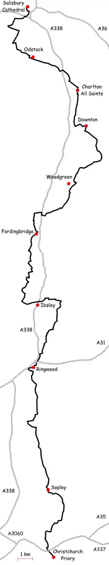 The path takes its name from the River Avon.[1] From Salisbury it passes through the towns of Fordingbridge and Ringwood as well as the villages of Odstock, Nunton, Charlton-All-Saints, Downton, Hale, Woodgreen, Turmer, Ibsley, Kingston, Sopley and Burton. It ends near the coast at Christchurch Priory, Dorset.[2]