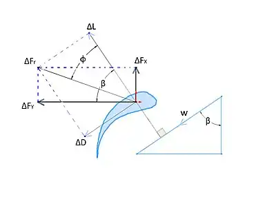 In this theory, a small element (dr) is taken at a distance r from the root of the blade and all the forces acting on the element are analysed to get a solution. It is assumed that the flow through each section of small radial thickness dr is assumed to be independent of the flow through other elements.[1][3]
