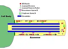 ![]() Eukaryotic flagellum. 1-axoneme, 2-cell membrane, 3-IFT (intraflagellar transport), 4-basal body, 5-cross section of flagellum, 6-triplets of microtubules of basal body. | |