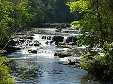 Aysgarth Falls are a triple flight of waterfalls,[1] surrounded by woodland and farmland, carved out by the River Ure over an almost one-mile (two-kilometre) stretch on its descent to mid-Wensleydale in the Yorkshire Dales of England, near the village of Aysgarth. The falls are quite spectacular after heavy rainfall as thousands of gallons of water cascade over the series of broad limestone steps, which are divided into three stages: Upper Force, Middle Force and Lower Force.[2]