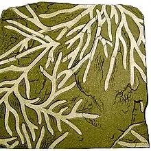 The fossil record of the Azilal Formation is very restrictive compared to the Tafraout Formation. Coral patch reefs rarely occur in the middle of the unit with echinodems (Sea urchin spines, Crinoid fragments) lamellibranchs, gastropods, solitary corals and algae.[37] Plant remains are very abundant in places such as the north of Jbel Akenzoud and partly impregnated and/or carbonized by malachite.[37]