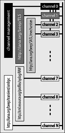 Profiles, channels and a framing mechanism are used in BEEP to exchange different kinds of messages. Only content type and encoding are defaulted by the specification leaving the full flexibility of using a binary or textual format open to the protocol designer. Profiles define the functionality of the protocol and the message syntax and semantics. Channels are full-duplex pipes connected to a particular profile. Messages sent through different channels are independent from each other (asynchronous). Multiple channels can use the same profile through one connection.