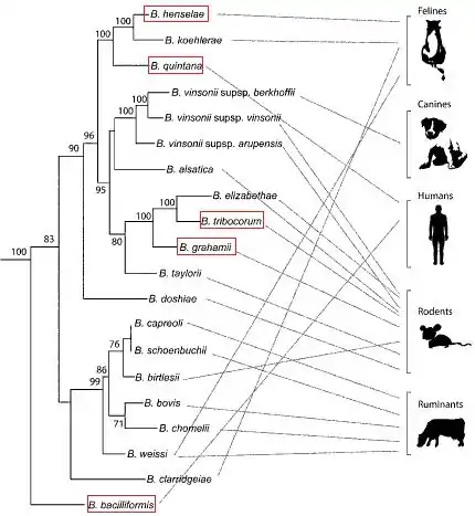 Bartonella henselae is a gram-negative bacterial pathogen of humans and animals. Like other members of the alphaproteobacteria subdivision, B. henselae is capable of establishing an intracellular lifestyle within eukaryotic cells (3). Infection of immunocompetent humans with B. henselae results in “cat scratch disease,” a regional lymphadenopathy that is typically associated with wounds of feline origin (12, 22). In most cases, the lymph node lesions are self-limiting and antibiotic therapy is not indicated (32). However, in 5 to 14% of infected individuals, atypical manifestations can occur, including prolonged fever, malaise, fatigue, myalgia, arthralgia, weight loss, splenomegaly, and Parinaud's oculoglandular syndrome (32). In contrast, infection of immunosuppressed humans can result in a variety of severe and life-threatening disease syndromes, such as bacillary angiomatosis, peliosis hepatis, endocarditis, and bacteremia (22). Even in cases of severe disease, antibiotic therapy is often effective, but relapses can occur (32).[1]