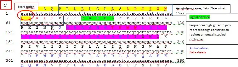 The importance of this protein lies in the beginning of the sequence, and is represented in the conceptual translation below. This region contains the aerotolerance motif, the transmembrane hydrophobic segment highlighted in yellow, and a high-conservation region represented in all studied orthologs. Furthermore, a signal peptide protein is present in this region that allows transport of a protein.