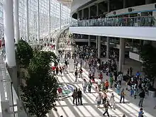 The arena encompasses 565,000 square feet (52,500 m2) and reaches a maximum height of 134 feet (41 m). Inside, the bowl area's ceiling rises 120 feet (37 m) over the base floor and a 930-foot (280 m)-long HD ribbon screen wraps around the three-level seating area. There are 17,343 fixed seats, each ranging from 20 inches (51 cm) to 22 inches (56 cm) wide—an average width greater than the industry standard, including that of Paycom Center in Oklahoma City.[1] Actual capacity fluctuates with configuration patterns, and total seating can vary from 13,644 to 19,199—13,644 for partial-use concerts, 16,582 for arena football, 17,096 for hockey, 17,839 for basketball, and 19,199 for center stage concerts.[2] The bowl area's second floor, an exclusive carpeted level with a complete bar, houses press areas and 37 luxury suites, each with 15 22-inch (56 cm) seats and furnished gathering and kitchen areas. In the main concourse, more than 130,000 square feet (12,000 m2) of terrazzo flooring has aggregate that contains 70% mother of pearl.[1] Private funding exceeded original forecasts, and unexpected increases in revenue from corporate sponsorships, donations, and purchases of box seats and luxury boxes paid for an advanced light display for the glass wall that wraps around the front of the building and the scoreboard.[18]