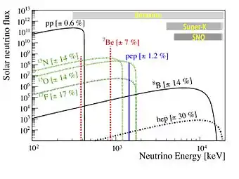 - ↑ Agostini, M; et al. (Borexino) (2019). "First Simultaneous Precision Spectroscopy of pp, 7Be, and pep Solar Neutrinos with Borexino Phase-II". Physical Review D. 100 (8): 082004. arXiv:1707.09279. Bibcode:2019PhRvD.100h2004A. doi:10.1103/PhysRevD.100.082004. S2CID 118938742.