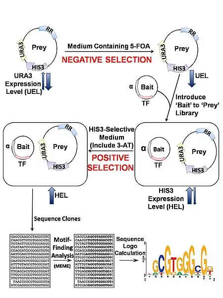 Using a negative selectable marker is crucial for greatly reducing the incidence of false-positives. Self-activating prey, where the randomized region facilitate reporter expression in the absence of TF binding, are removed by transforming the reporter vector library into bacteria in the absence of bait and assaying for growth on plates containing 5-fluoro-orotic acid (5-FOA). The protein product of URA3 converts 5-FOA into a toxic compound, thereby allowing survival of only those colonies that contain reporter vectors which are not self-activating. Negative selection normally precedes positive selection so that a smaller, purified prey library can be subjected to the more rigorous positive selection process. Upon transformation of the purified prey library with the bait plasmid, positive selection is achieved by growing the host E. coli on minimal medium lacking histidine (NM selective medium) that is usually supplemented with varying concentrations of 3-amino-triazole (3-AT), a competitive inhibitor of HIS3. HIS3 encodes a protein required for histidine biosynthesis and thus only those cells containing bait-prey combinations that activate the reporter genes will be able to grow. Manipulating 3-AT concentrations allows for the characterization of binding stringencies. In this way, researches can gauge how strongly bait binds its prey (correlated with the level of expression of HIS3) and thus determines which nucleotide binding-sites have strong or weak preferences for a given base. In other words, if cells can grow despite a high concentration of 3-AT, bait-prey binding must be of high enough stringency to drive reporter gene expression (HIS3) at a sufficient level to overcome the resulting competitive inhibition. Finally, positive clones are sequenced and examined with preexisting motif-finding tools (ex, MEME, BioProspector).[3]