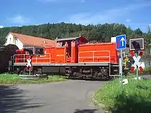 A railway crossing at the Kurpark on the Knüllwaldbahn, nowadays only used for goods services