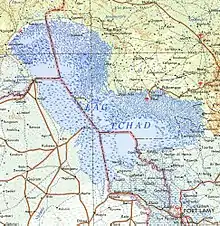 The town is approximately 196 km from Maiduguri, the capital of Borno State.[1] The "Doron Baga" fish market, as of 2000, was located about six kilometres from the town.[1] Baga used to lie on the border of Lake Chad and was a fishing center itself in the 1960s and 1970s, but the diminishing size of the lake has caused fishermen to move, and others have turned to subsistence farming.[2][3][4]
