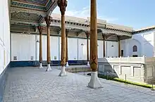 3. At the complex, there is a mosque called Khakim Kushbegi, with a flat trabeation, supported by two columns and forming six painted plafonds. To the south adjoins iwan with five columns and the same number of painted plafonds. To the north is another iwan, also with five wooden columns, a beam ceiling, and a vassa.