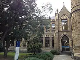 The key architectural elements include the heavily rusticated freestone walls, buttresses, a conical roofed round turret with spiral stair, dressed stone arched window heads, drip moulds and a parapet decorated with trefoils. Internally the original theatre, laboratory and staircases are still retained; one of the laboratories still contains its original slate benches. In the library, the ceiling is panelled timber with chamfered beams and decorated cast-iron vents.[3][4][5]