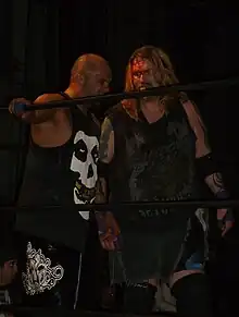Mahoney's first singles match at a pay-per-view was a victory over Steve Corino at Living Dangerously.[18] Shortly after, Mahoney formed a tag team with Spike Dudley. At Hardcore Heaven, the two faced the Dudleyz in a championship match but failed to win the title.[19] The two teams faced in a rematch at Heat Wave, and this time, Mahoney and Dudley won the match and the World Tag Team Championship, marking Mahoney's second individual reign.[4][16][20] At a show in August, the duo re-lost the title to the Dudleyz.[21]