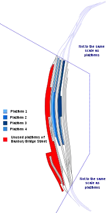 At that time, the three through platforms were numbered 1, 3 and 4 from west to east, whilst the three bays were numbered 2, 5 and 6. All but one have since been re-designated: the present-day platform 2 was formerly platform 3, whilst the unnumbered bay at its northern end was originally platform 2,[13] and present-day platforms 3 and 4 were formerly platforms 4 and 6 respectively.[14] Platform 5, at the northern end of the present platform 3, has lost both its track and its number.