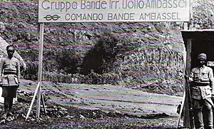Locally recruited bands were employed in the conquest of Italian Libya from 1911 to the 1930s. Their Somali counterparts played an important role in Italian Somaliland during the 1920s.[2] In "Somalia italiana", the Italians also employed Dubats; levies that were maintained on a permanent basis and were better trained and equipped than the Banda. During the guerrilla war that continued in Ethiopia after the 1936 Italian invasion, Bande were recruited amongst groups collaborating with the Italian regime. One of the best known of these was the Gruppo Bande irregolari "Uollo Ambassel" in northern Ethiopia.