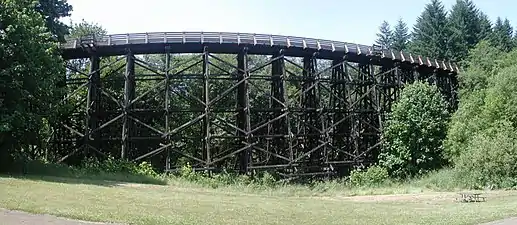 The Banks–Vernonia State Trail was the first linear rail trail state park in Oregon.[4] The Portland, Astoria & Pacific Railroad built the original rail line in 1913 to transport timber, freight, and passengers.[2] In the 1920s, trains on the line hauled logs and lumber from Keasey and the Oregon-American mill in Vernonia to Portland.[4][5] The railroad stopped using the line in 1957 after the mills closed, and from 1965 through 1969 the Vernonia South Park and Sunset Railroad leased the line for a steam excursion train.[4]
