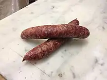 Bardiccio, also known as bardiccio fiorentino,[1] or salsiccia matta[2] is a typical Tuscan cold cut, similar to burischio,[3] whose preparation is based on the use of the less valuable and rich in blood parts[4] of pork. Its typical dark red color depends on the quantity of heart - generally bovine - used in the mixture. Bardiccio has the characteristic shape of a sausage, but it is longer and is stuffed into a pork casing, tied with string. It is produced from September to May and is eaten unaged.[5]