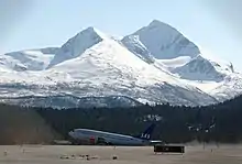 Scandinavian Airlines is the only airline serving the airport with scheduled flights, consisting of three daily flights to Oslo Airport, Gardermoen.[32] The Norwegian Armed Forces is the largest purchaser of travel at the airport and operations are based on a contract between the two parties, resulting in scheduled flights.[20] The airport handled 207,650 passengers, 5,279 aircraft movements and 56 tonnes of cargo in 2013.[2]