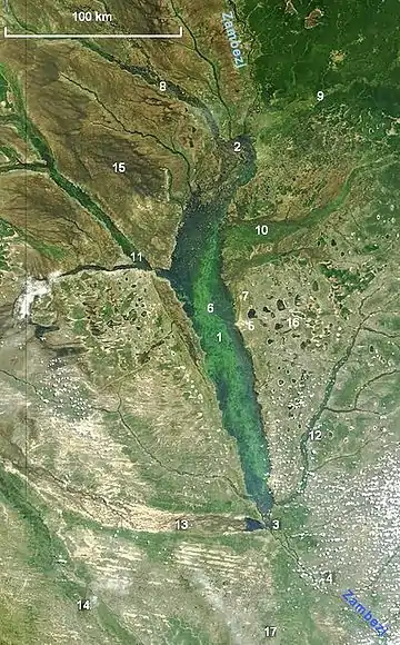 NASA satellite photograph showing the Barotse Floodplain as the bright green to dark blue central region. 1 The Zambezi flowing north to south through the middle of the floodplain; 2 confluence of (left to right) the Lungwebungu, Southern Kashiji, Zambezi and Kabompo Rivers, marking the start of the floodplain; 3 end of the floodplain south of Senanga; 4 Ngonye Falls on the Zambezi; 5 Mongu, capital of Barotseland; 6 Lealui, seat of the Litunga on the floodplain; 7 Limulunga, seat of the Litunga during the flood; 8 swamps and floodplain of the Lungwebungu; 9 the Kabompo drains an area of Cryptosepalum dry forest; 10Luena Flats (floodplain); 11 Luanginga River floodplain near Kalabo; 12 Lui River with narrow floodplain; 13 a broad floodplain which carries overspill from high floods of the Cuando River in Angola; 14 Cuando river and floodplain, on the border between Angola and Zambia; 15Liuwa Plain National Park; 16 The flat sandy Central Zambezian Miombo woodland west of Mongu features many pans; 17 Sioma Ngwezi National Park.[2]