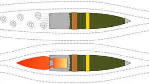 Simplified diagram of a base-bleed artillery shell reducing turbulent vortices