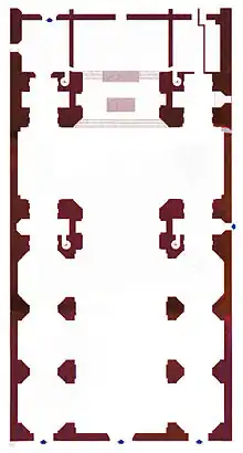 The interior has a basilica plan with three naves, 58.75 meters long and 24 meters wide at the transept, 36 meters high at the dome lantern.[26] The nave is covered by a lunetted barrel vault, while the two side naves, located to the left and right of the main nave, are covered by barrel vaults arranged orthogonally to the vault at the main nave.[26] Natural lighting is provided in the nave by six lunettes, three on each side, while in the dome by the lantern windows.[26] The total expenditure for the work was between 12,000[26] and 24,000 pontifical scudi.[27]