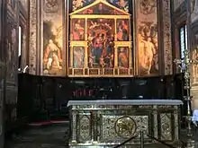 Behind the main altar is a polyptych by Bernardino Luini from 1523 depicting the Madonna and Child, seven musician angels and four saints (John the Baptist, saint Peter, Magnus and Ambrose).[50] This work is flanked by God the Father depicted in a tympanum.[3] On the lower predella, inside the small vertical compartments, saint Luke and saint John, the Ecce homo, saint Matthew and saint Mark are depicted in dark light, while in the horizontal sections the Christ nailed is painted, again with the same technique the crucifixion of Jesus, the Pose in the Sepulcher, the Resurrection of Jesus and the supper at Emmaus.[41]