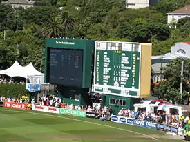 The Basin Reserve, also known as the Cello Basin Reserve for sponsorship reasons,[1] and commonly referred to as the Basin, is a cricket ground in Wellington, New Zealand. It is used for Test matches, and is the main home ground of the Wellington Firebirds first-class team. The Basin Reserve is the only cricket ground to have listed status with Heritage New Zealand, in recognition of being the oldest first-class cricket ground in the country.[2] Historically, the ground has also been used for events other than cricket, such as association football matches, concerts and cultural events.