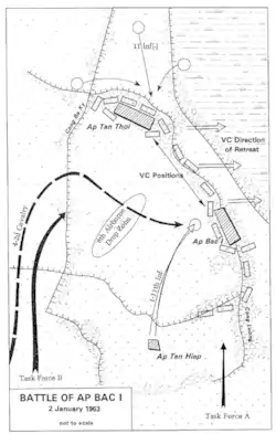 On previous occasions, US intelligence had tracked down the location of Viet Cong radio transmitters. However, those were often relocated before the South Vietnamese launched their attacks, so Ziegler privately questioned if the VC had as many as 120 soldiers in Ap Tan Thoi.[1] However, in 1963, the VC had changed its policy from avoiding the ARVN to standing and fighting. The 1st Company, 261st Battalion, and the 1st Company, 514th Battalion, had a total strength of 320 regular soldiers and were positioned in Ap Bac and Ap Tan Thoi, respectively, which were separated by a distance of about 1.5 kilometers (0.93 mi). The combined companies were supported by approximately 30 local force soldiers from Chau Thanh District who served as scouts, ammunition bearers, litter-bearers, and emergency replacements.[24] Together, elements of the VC 261st and 514th Battalions in Ap Tan Thoi and Ap Bac formed a "composite battalion", which was placed under the command of Colonel Hai Hoang.[25]
