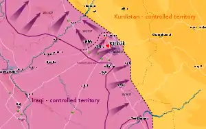 The Battle of Kirkuk (2017), part of the 2017 Iraqi–Kurdish conflict, was a military deployment by the Iraqi Security Forces to retake Kirkuk Governorate from the Peshmerga after the latter ignored repeated warnings to withdraw,[17] sparking clashes between the two forces.[18] The advance began on 15 October 2017, with the city of Kirkuk being retaken the following day. Iraqi central government forces continued their advances in subsequent days, routing the Peshmerga forces across vast swathes of territory in northern Iraq.[1]