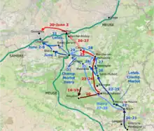 - Wiernois-Vallee and wood of Moncaux (Modern Monceau-sur-Sambre) via Drie-du-Pere-Saint-Jacques (approximately Place des Perziaux in Fontaine l'Eveque) and Bois de Marche (south of Forchies-la-Marche)[5]
