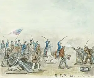 Once Benteen and Philips reached the main Confederate line, the position did not hold long. The Union troopers' repeating rifles gave them a firepower advantage over the Confederates, who were mostly armed with single-shot weapons. Clark's Confederate brigade became engaged in a melee, and quickly fell back. Marmaduke's other brigade, Freeman's, contained mainly newly recruited men and fell back before the Union charge completely reached their line. After Clark and Freeman fell back, the position of Cabell's Confederate brigade became exposed, and it too retreated. Soon, almost the entire Confederate line was in retreat towards the crossing of Mine Creek.[14] Unable to cross the creek, many of the Confederates soldiers were captured.[11] One of the prisoners was Marmaduke himself. The Confederate general was captured by Private James Dunlavy of the 3rd Iowa. As a reward for capturing Marmaduke, Dunlavy was given military leave for the remainder of his time of service.[15] Dunlavy later received the Medal of Honor for "[g]allantry in capturing Gen. Marmaduke".[16] Cabell was also made a prisoner, and the Union troops captured either eight[11] or ten cannons.[15]