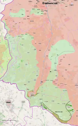 On 4 April, the al-Nusra Front pulled back from the border crossing, leaving it to a civil administration. According to the SOHR, al-Nusra Front abducted at least 35 truck drivers from the border crossing.[4] It was agreed in the 'courthouse of Horan' that all abducted truck drivers will be released within 24 hours that the border crossing must be managed by a civil administration.[16] As of 6 April, two truck drivers were still being held captive.[17] On 11 April, al-Nusra Front pulled back from the duty-free zone between the Syrian and Jordanian crossings at the request of the Southern Front.[5][18] A spokesperson for the Southern Front said they would not cooperate militarily with al-Nusra Front.[5]