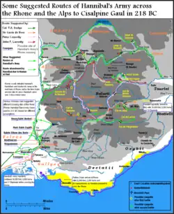Hannibal had expected Scipio to march up the Rhône to engage him,[189] if the Romans followed after him, Hannibal would have the opportunity to ambush the Romans, if Scipio turned back to Massalia, the eight-day roundtrip would give the Carthaginians a crucial head start towards Italy,[188] and should Scipio's army then head back to the Po valley, the threat to Spain would be eliminated without fighting a battle.[189] The day after the skirmish, Hannibal deployed his cavalry southward to screen his army from any Roman intervention,[199] while his infantry marched north, the baggage train moved north the following day.[200] The elephants completed their crossing on the following day, and Hannibal led the elephants, his cavalry, and rearguard north to cross the Alps.[201] Hannibal's crossing of the Alps in 218 BC was one of the major events of the Second Punic War, and one of the most celebrated achievements of any military force in ancient warfare.[202] The exact route Hannibal took is subject to debate and discussion among scholars, in 1891, Historian Theodore Ayrault Dodge found 350 distinct work on the subject, and in the hundred-plus years since then, more opinions have emerged,[203] and one historian, humorously commented before 1914 that he would need 100 years to cover the existing literature on Hannibal's Alpine crossing.[202]