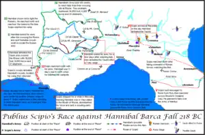 As Hannibal had anticipated, Rome expected the Carthaginians to fight a defensive war with minor attacks in Sicily, and therefore planned to attack both Spain and Africa.[18][19][20] Understanding that a simultaneous strike against both Spain and Carthage at the earliest opportunity would give Hannibal the opportunity to defeat their armies in detail,[21] they planned first for[22] Scipio to engage Hannibal either north of the Ebro or east of the Pyrenées or the Rhône, where he could receive aid from allied Iberians or Gauls,[23][24][25][26][27] and after Scipio had located and engaged Hannibal's forces, Sempronius, stationed in Sicily, would invade Africa.[28][29]