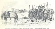 Davies attacked the lead section of the wagon train, two companies of artillery, 4 miles (6.4 km) east of Paineville, and quickly rounded up 300 soldiers and as many African-American teamsters.[36] The Union cavalrymen cut many horses and mules out of their traces, captured five new Armstrong guns and burned more than 100 wagons of provisions.[36] Davies's troopers destroyed Major General George Washington Custis Lee's supplies including all the spare ammunition.[37] Leading wagons from the train which left Amelia Court House, including Fitzhugh Lee's headquarters baggage, Robert E. Lee's headquarters wagons with many reports and some ambulances and medical supplies, also were caught by the Union raiders.[35][38] Stragglers and sick soldiers finally gathered to stop the destruction.[38]