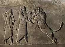 In the carvings of this period, there have also been developments that can be seen in the increase of animal and combination designs, the designs of the Gate of Nations, the winged ox with a human head (Lamassu), the repetition of the carvings of the cow hunting by lion and the repetition and emphasis of the Shahriar battle designs with the combined animals and evils have been seen since this period. Some scholars believe that these designs influenced by the Assyrian palaces were inspired by artists who serves in Persian palaces, and the township that had been defeated far beyond its territory compensated for defeat in the internal fence of the realm.[2]
