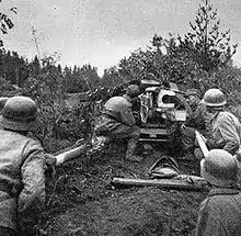 The Soviet 23rd Army attempted to start the crossing of the River Vuoksi on July 4 at Vuosalmi, but due to the Finnish defense at Äyräpää Ridge, it was unable to start the crossing before July 9.[47][48] Even with the crossing completed, the Soviet forces consisting of elements from three Soviet divisions were not able to expand the beachhead against the defending Finnish 2nd Division, which was later reinforced.[5][47][48] The unsuccessful Soviet breakthrough attempts continued there until July 21.[47]