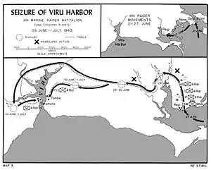 The Battle of Viru Harbor was a battle of the Pacific campaign of World War II that took place on New Georgia island during the New Georgia campaign from 28 June – 1 July 1943. It was one of the first actions of the campaign and involved an overland advance by elements of a Marine Raider battalion, supported by a United States Army infantry company. Supported by airstrikes, the Marines carried out an enveloping attack on the Japanese defenders around the harbor and forced them to withdraw. The harbor was subsequently used by US forces to support further operations, although plans to build a PT boat base in the area were later canceled when the harbor was found to be unsuitable.