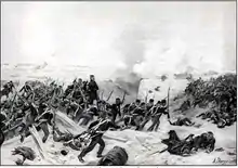 The Battle of the Great Redan (or the Storming of the Third Bastion;[3] Russian: Оборона Третьего бастиона, Штурм третьего бастиона) was a major battle during the Crimean War, fought between British forces against Russia on 18 June and 8 September 1855 as a part of the Siege of Sevastopol. The French army successfully stormed the Malakoff redoubt, whereas a simultaneous British attack on the Great Redan to the south of the Malakoff was repulsed. Contemporary commentators have suggested that, although the Redan became so important to the Victorians, it was probably not vital to the taking of Sevastopol. The fort at Malakhov was much more important and it was in the French sphere of influence. When the French stormed it after an eleven-month siege that the final, the British attack on the Redan became somewhat unnecessary.[4]
