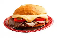 Bauru is a popular Brazilian sandwich. The traditional recipe calls for cheese (usually mozzarella) melted in a bain-marie, slices of roast beef, tomato and pickled cucumber in a pão francês with the crumb (the soft inner part) removed.[1]
