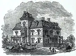 One of Newport's oldest mansions, Beaulieu was originally built in 1859 by the Peruvian merchant, Federico Barreda, who made his money in the 1850s guano trade.[lower-alpha 1][3] Beaulieu was designed for Barreda by New York architect Calvert Vaux, who also designed the bridges in New York's Central Park.[4] In July 1859, Barreda paid $24,000 for about nine acres on the Bellevue Avenue hill overlooking Narrangansett Bay. He then hired Vaux for a five percent fee on a construction budget of $100,000. Eventually he went over his budget, and spent at least $26,000 more on furnishings and interior decoration. This seasonal "cottage" had sixteen bedrooms, a library, billiard room, a wide surrounding veranda and ample quarters for housekeepers, nannies and cooking staff.