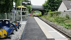 Following a local campaign, the station was reopened on 15 April 2002.[4] A new single platform, shelter and car park were built in a £250,000 project.[12] The platform is the shortest in Great Britain: at the length of 15.06 metres (49 ft 5 in),[13] it is shorter than a single carriage of a Class 158 train that is usually used on this line.