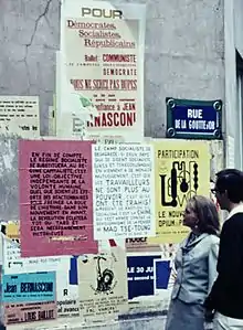 They comment on topics including the freedom of the press (see also Censorship in France), colonialism (see also French colonial empire) and the status of immigrant workers (see also Immigration to France).[4] The posters were also used to voice opposition to consumerism and were inspired by the Situationist International's critique of the spectacle and Georges Perec's 1965 novel Things: A Story of the Sixties.[3]
