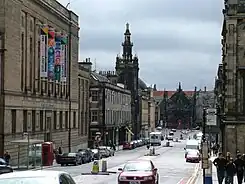 Nevertheless, the building forms an important part of the Old Town's cityscape, terminating the view south along George IV Bridge.[12][40] Two decades prior to the opening of the New North Free Church, Hamilton had, along with William Burn, led the design of civic improvements in the Old Town. Hamilton's plans were not executed in their entirety but they included both the George IV Bridge and the triangular block formed by Teviot Row, Bristo Place, and Forrest Road at whose northern point the Bedlam Theatre now stands.[40]