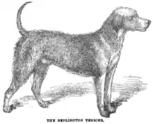 Bred in the village of Bedlington in Northumberland, the Bedlington Terrier has been described as "the favourite companion of the northern miners".[9][8] They were originally known as Rodbury Terriers,[1] Rothbury Terriers,[1][4] or "Rothbury's Lambs",[4] because the Lord of Rothbury had taken a particular liking to the dogs.[4] Before this, they were known as "gypsy dogs", as the Romani people—called 'Gypsies' in those days—and poachers used them to hunt.[4] The first mention of the Bedlington terrier, or as it was then known, the Rothbury or Rodbury Terrier,[8] was in 1825,[9] most likely in The Life of James Allen,[8] but some dogs' pedigrees have been traced as far back as 1782.[9] James' father, William, was much in demand as an otter hunter, and he kept Bedlington Terriers in order to help him hunt.[8] They were also valued by their owners as rabbit coursing dogs and racing dogs,[9] until the Whippet became more popular as a racing dog and a courser.[11]