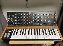 There are wooden panels on either side, and the back panel is made of black aluminium, closely resembling a Minimoog. The marketable differences from the Minimoog lie in the addition of aftertouch, the BBD Stereo Chorus, DS-1 modeled distortion circuit, Behringer arpeggiator and 32 step sequencer, and the aforementioned switchable voice modes.