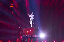The Belarusian performance featured Alekseev wearing a white shirt and black trousers, performing on stage together with a ballet dancer who wore a full length red Flamenco inspired dress.[21][22] The performance began with Alekseev on a platform while singing to a red rose which he then presented to the camera. The rose was then handed to the dancer who fired it back through Alekseev's hand with a bow. The platform was later raised up from the stage, and was concluded with Alekseev turning his back showing a rose injury.[22][23] The dancer that joined Alekseev was Yulia Zima-Blazhkiv, while the singer was also joined by four off-stage backing vocalists: Anna Kilchenko, Anyanya Udongwo, Valeriya Khomenko and Vilen Kilchenko.[24][25]