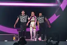 The Belarusian performance featured Zena wearing a crop top and pants in comic-inspired print as well as thigh-high white boots, performing on stage together with two male dancers and two female dancers, the latter which also performed backing vocals. The performance began with Zena sitting on a music equipment boxes, carried by the male dancers to centre stage.[14][15] The LED screens displayed various coloured animations, while the stage featured several music equipment boxes as well as smoke and pyrotechnic flame effects.[16] The four dancers that joined Zena were: Ali Gudiev, Mike Isaev, Radmira Mantuliny and Sofia Mantuliny. An additional off-stage backing vocalist was also featured: Olga Dorozhey.[17]