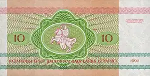From the collapse of the Soviet Union until May 1992, the Soviet ruble circulated in Belarus alongside the Belarusian ruble. New Russian banknotes also circulated in Belarus, but were replaced by notes issued by the National Bank of the Republic of Belarus in May 1992.[4] The first post-Soviet Belarusian ruble was assigned the ISO code BYB and replaced the Soviet currency at the rate of 1 Belarusian ruble = 10 Soviet rubles. It took about two years before the ruble became the official currency of the country.[4]